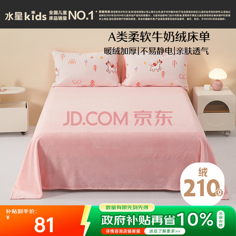 水星儿童A类牛奶绒床单单件 抗菌床单暖绒学生儿童床单180*230cm¥125.3 已售:0